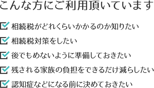 住宅・預金・保険など相続に関する専門家が相談にのります。財産や名義について整理し、不安を解消するお手伝いをしています。相続税対策についてのアドバイスも行っています。